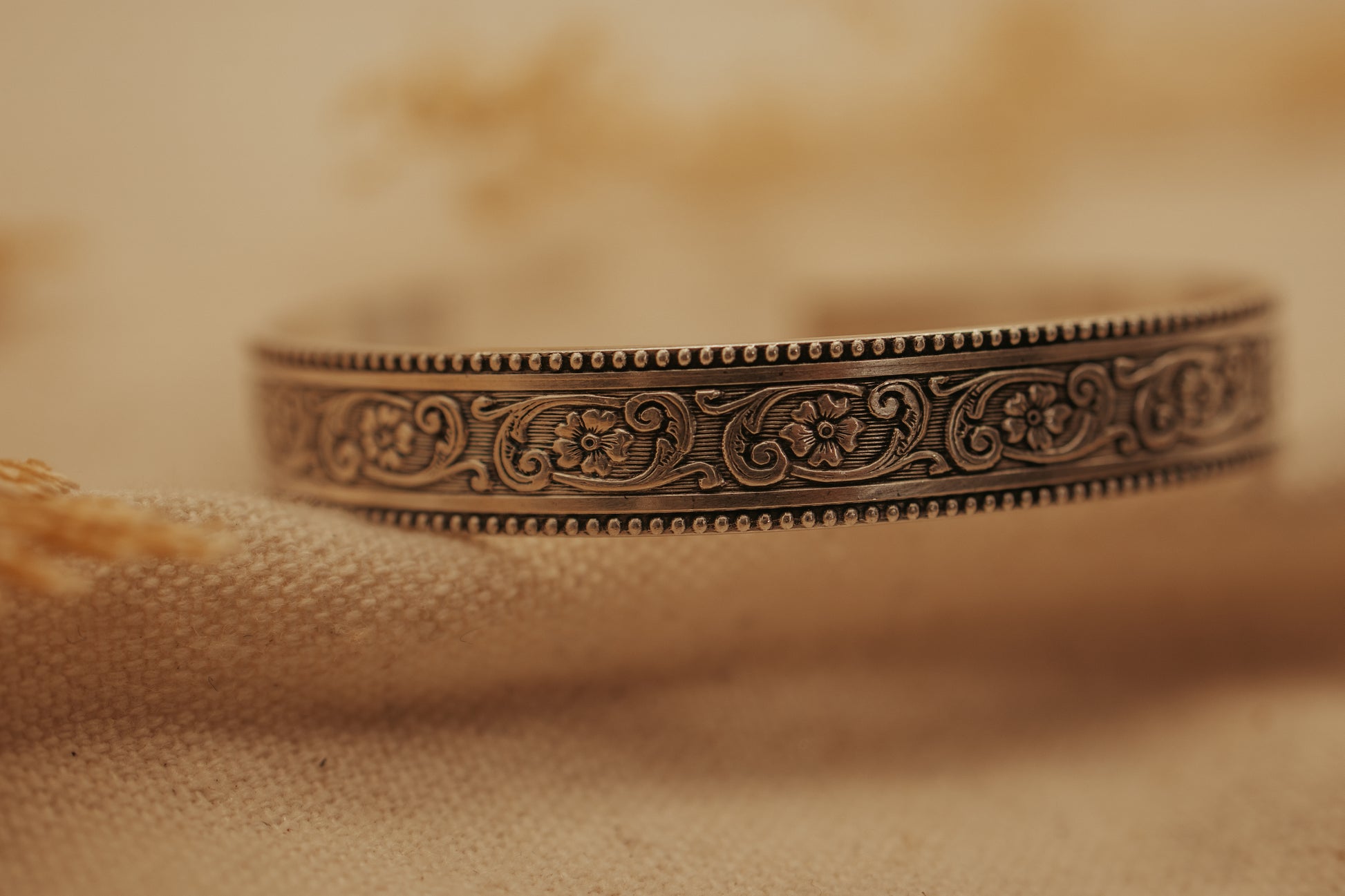 The Rooney Cuff is a timeless piece with a vintage western feel. Crafted from genuine sterling silver, it features a detailed floral and scroll pattern that gives it an antique-inspired look. The open design makes it adjustable, offering a comfortable fit for everyday wear.