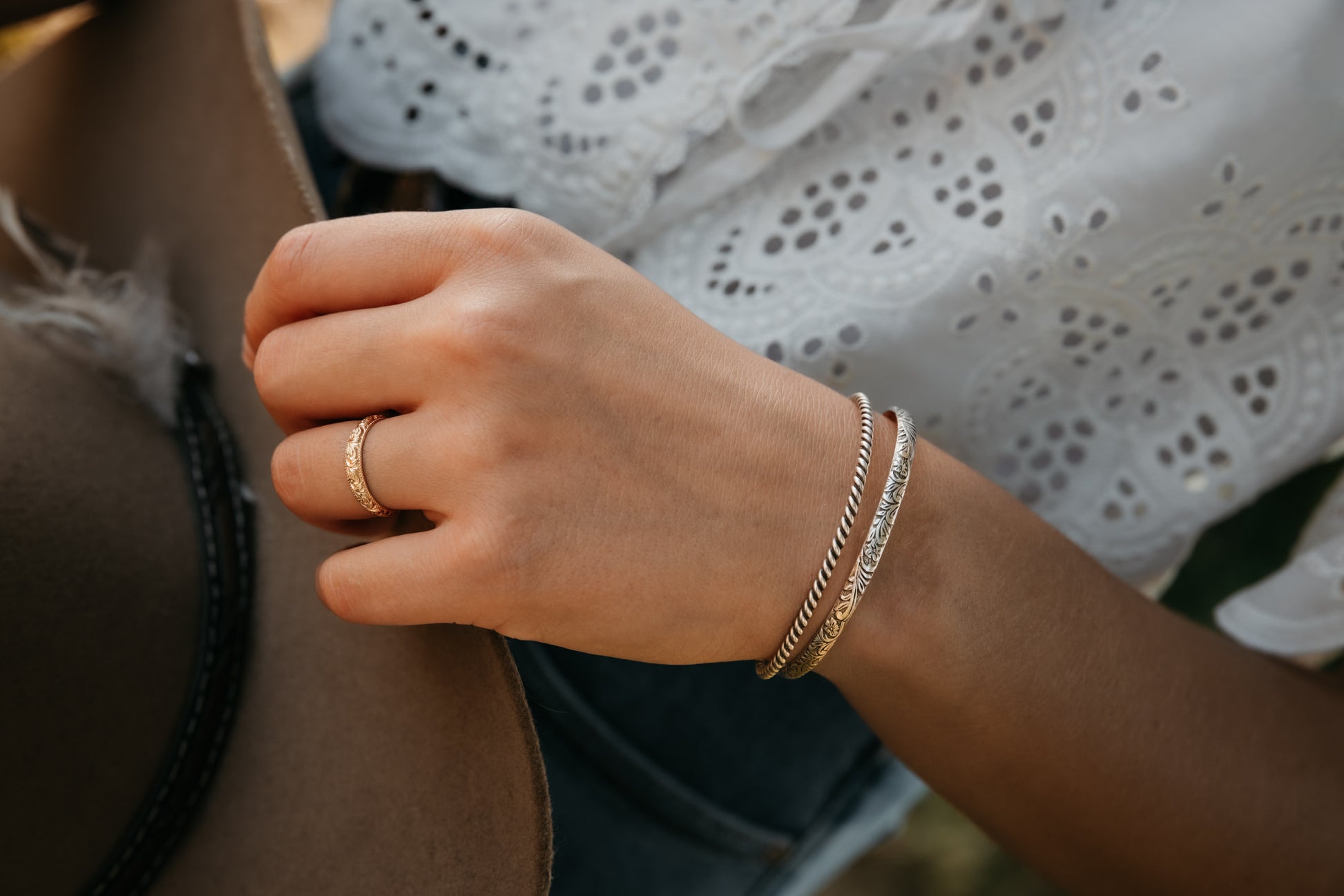 Available in polished silver or a patina finish for a darker, vintage-inspired look. Shown paired in first two images with the Jolene cuff.