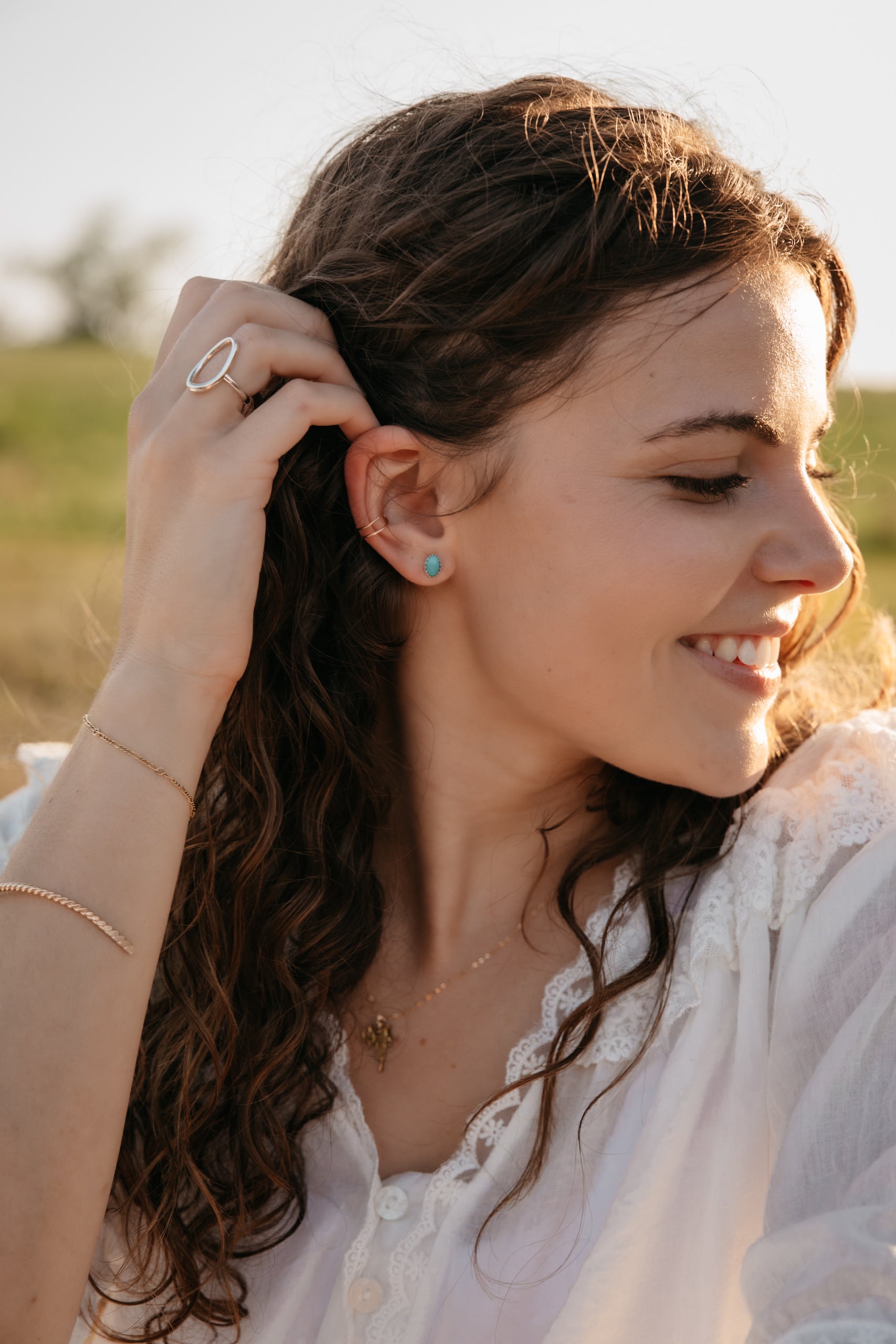 Crafted from genuine stabilized Kingman turquoise and .925 sterling silver, these dainty studs bring a subtle pop of color to your everyday look. Their simple and timeless design makes them perfect for wearing solo or paired with other earrings for a layered style.