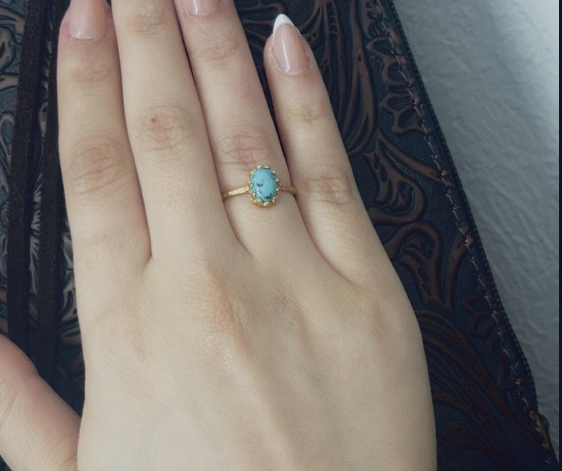 This ring has it all - dainty, darling, and adjustable. The open back on this ring allows for it to adjust form size 6 to size 8, allowing it to be worn on different fingers. Kingman turquoise set in 14k gold-fill makes this piece timeless and heirloom quality.