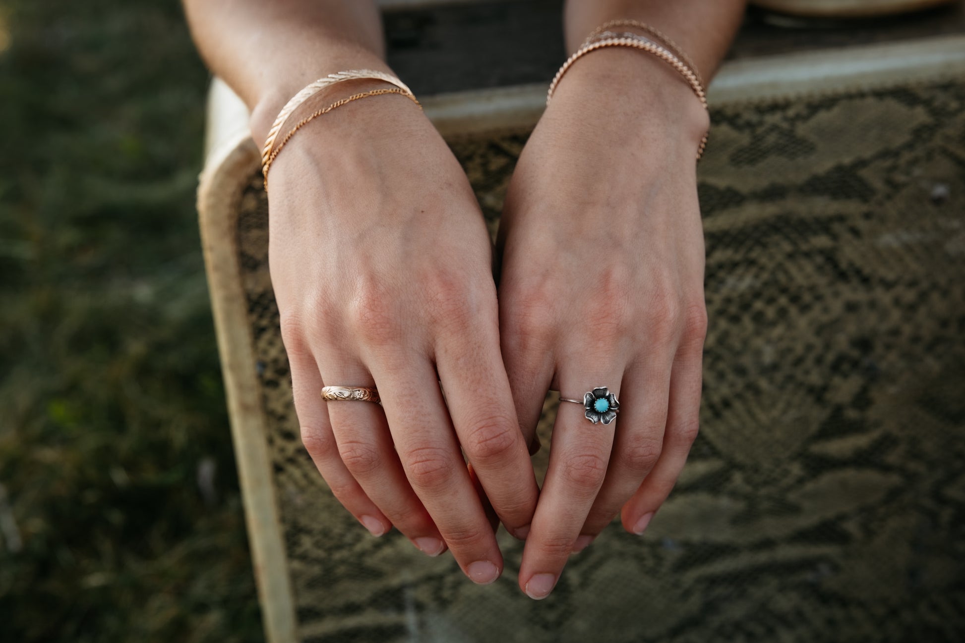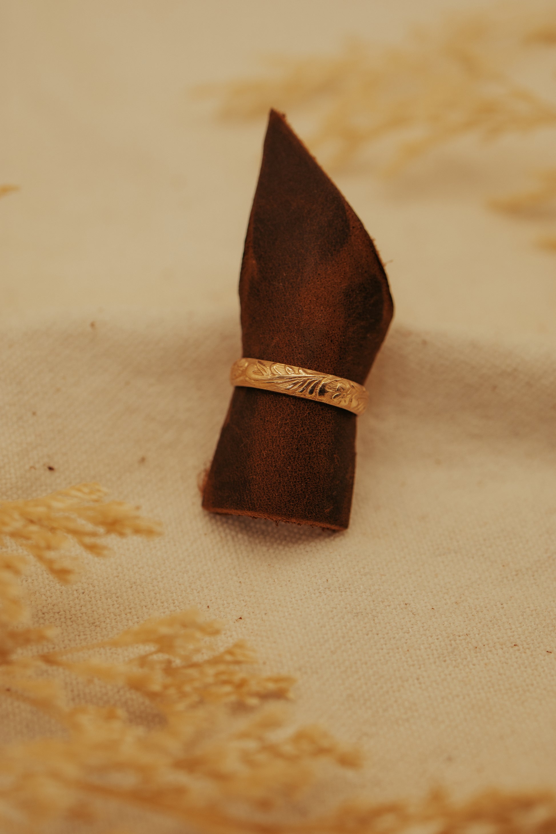 The Marlowe Ring carries the feel of a vintage heirloom with its engraved floral tooling, reminiscent of classic western leatherwork. Crafted in 14k gold-fill, it’s durable, feminine, and perfect for the cowgirl who loves subtle details.