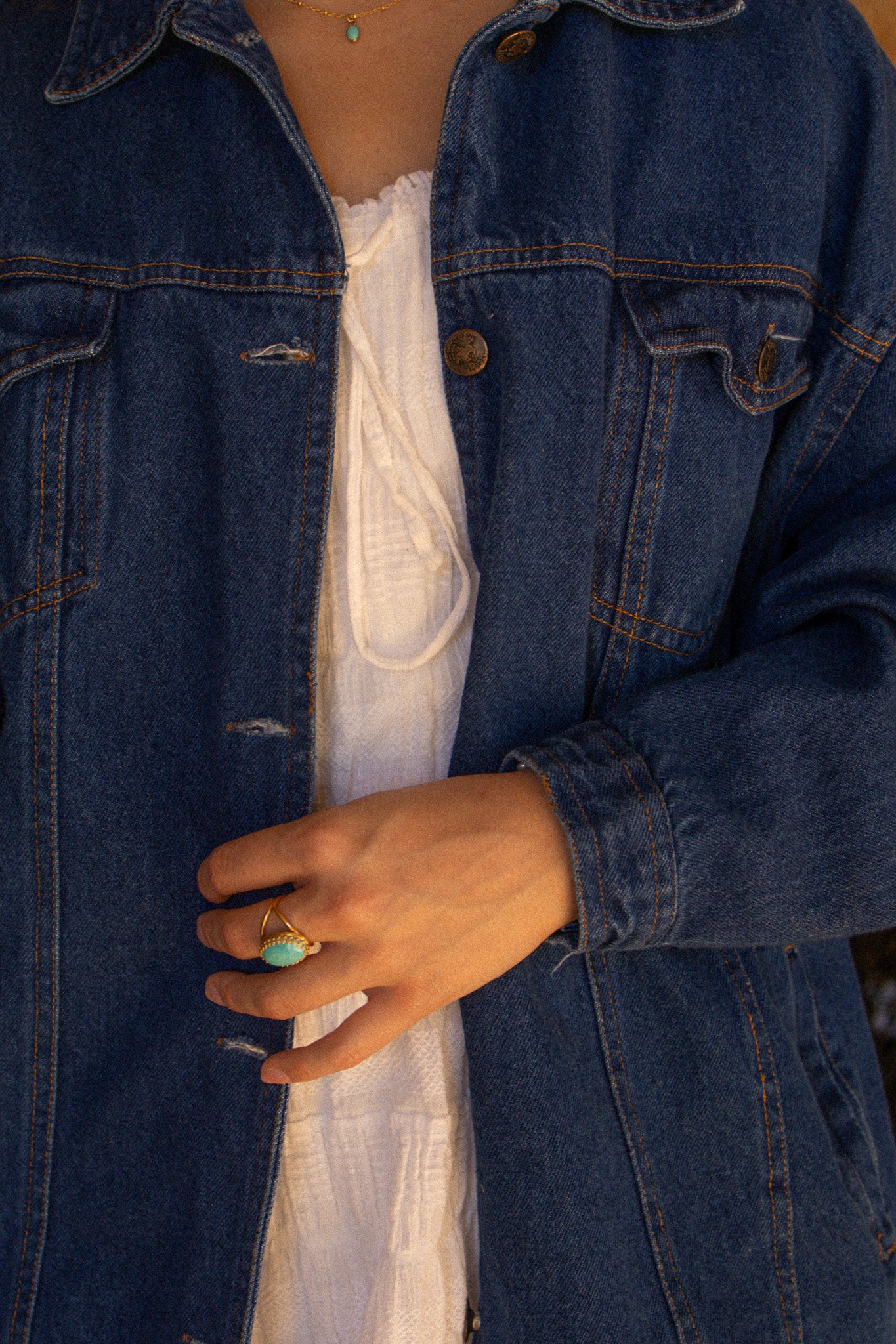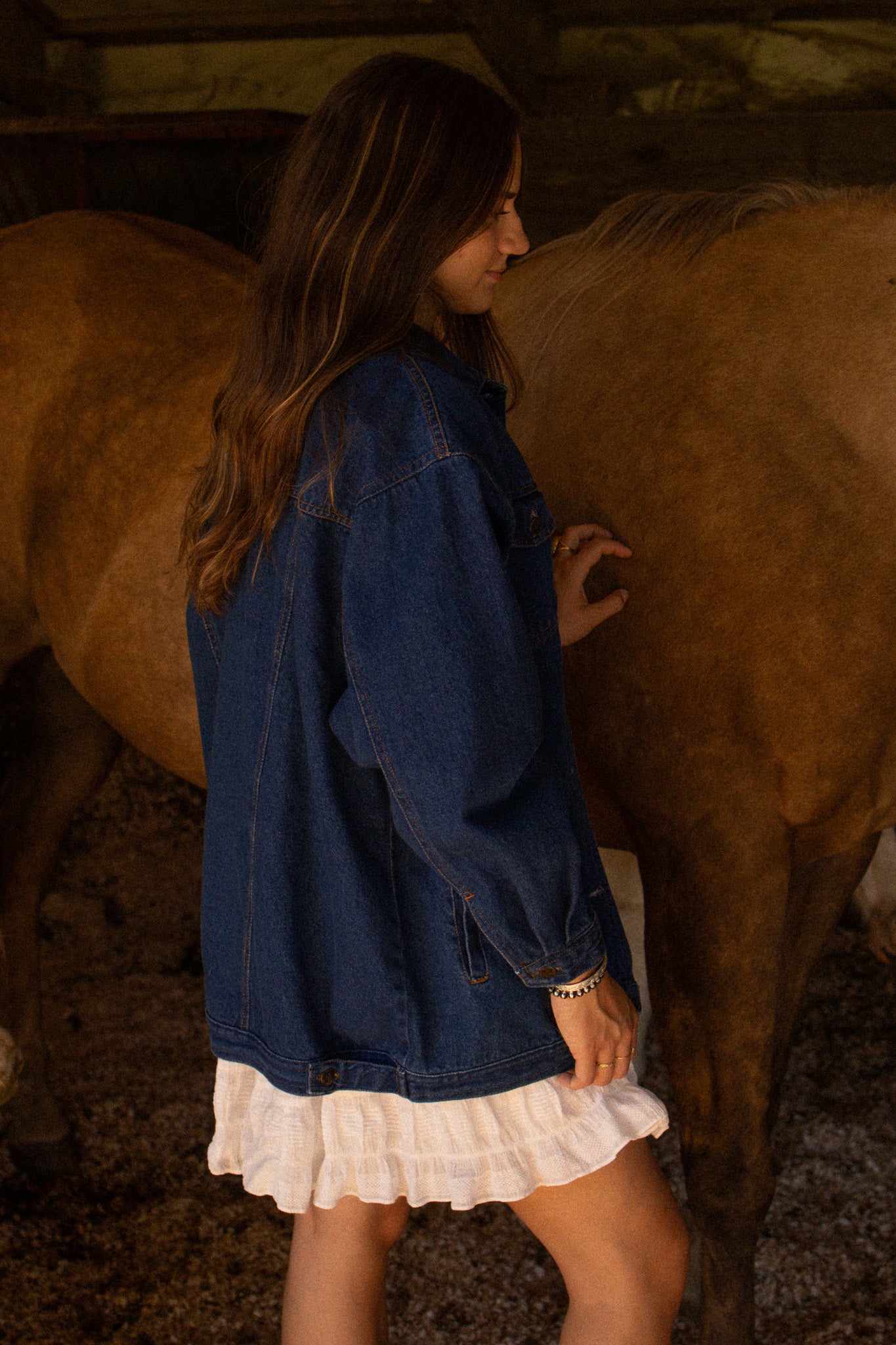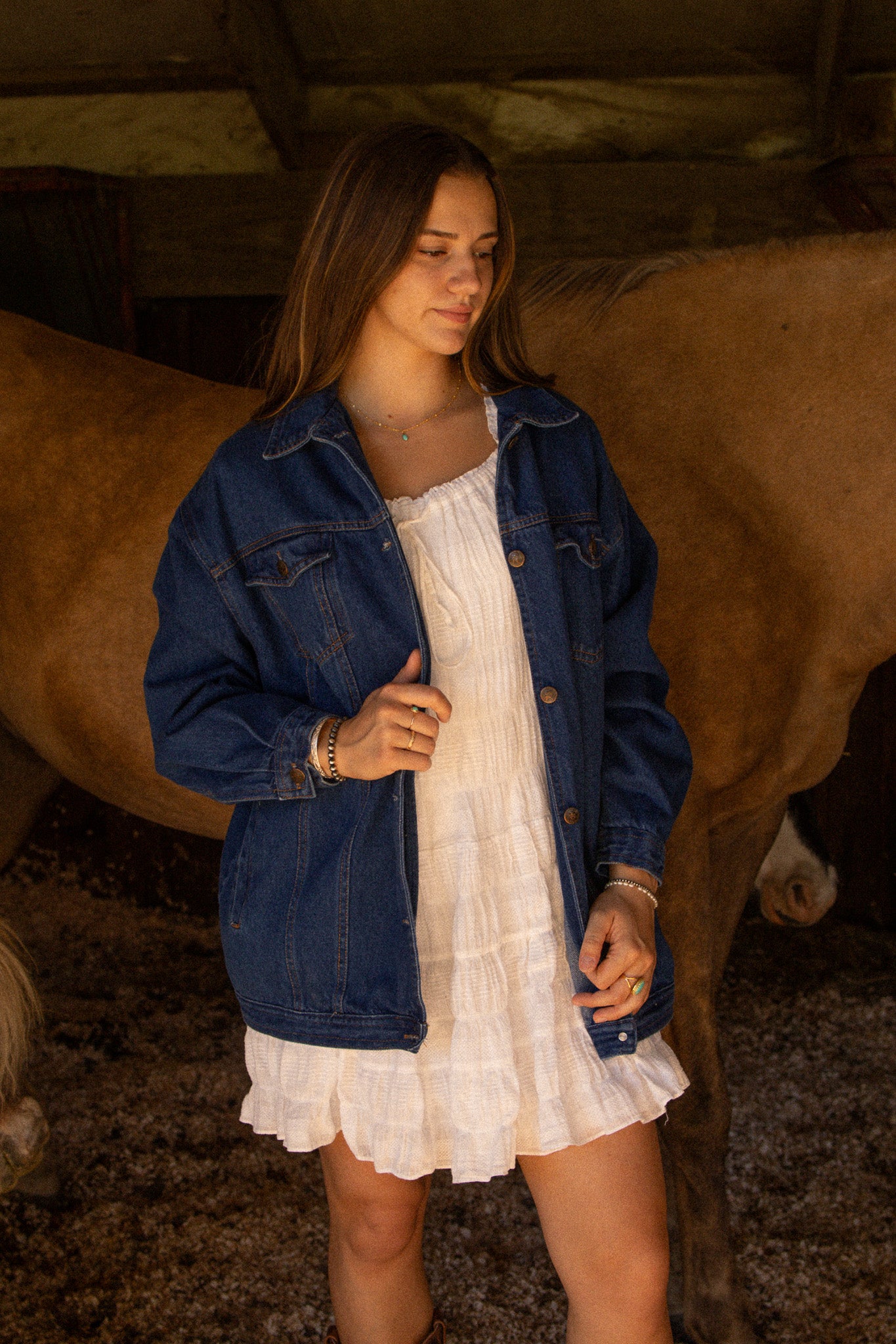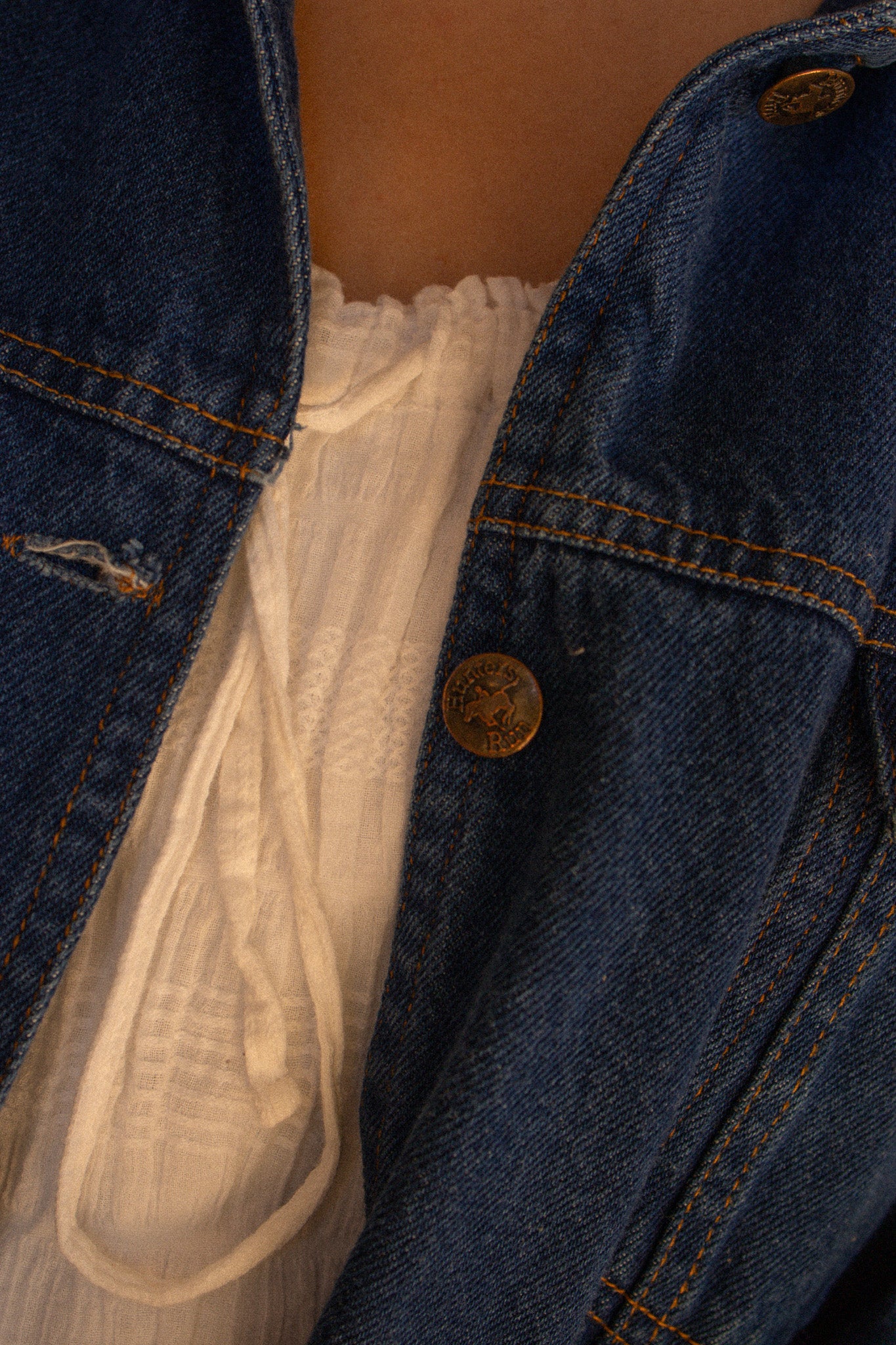 The standout detail? The horse buttons — a unique touch that makes this jacket truly one-of-a-kind. With its oversized fit and classic workwear design, it layers perfectly over dresses, knits, or flannels for that rugged-yet-feminine cowgirl look. A collector’s piece for anyone who loves vintage denim.