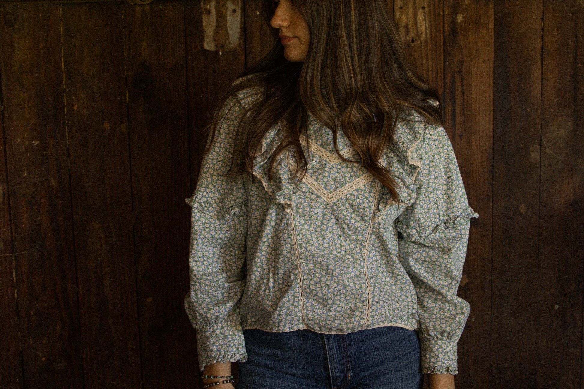 Romantic and timeless, The Cora Top features a delicate blue floral print, puff shoulders, and feminine ruffle detailing along the bodice and sleeves. Soft lace trim adds vintage charm, while the lightweight fabric makes it an easy piece to wear year-round.